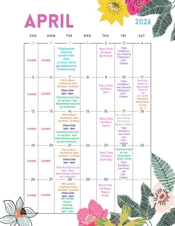 The mission statement of the Waverly Free Library is to provide patrons of all ages with a friendly atmosphere for access to varied categories of multi-media materials and services. Ensuring equal access to electronic resources to those who lack private access is part of the Library’s mission.