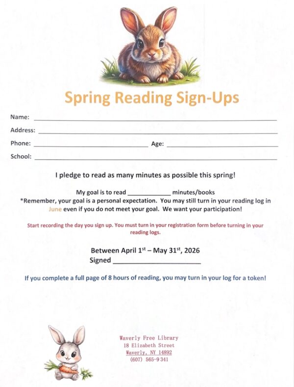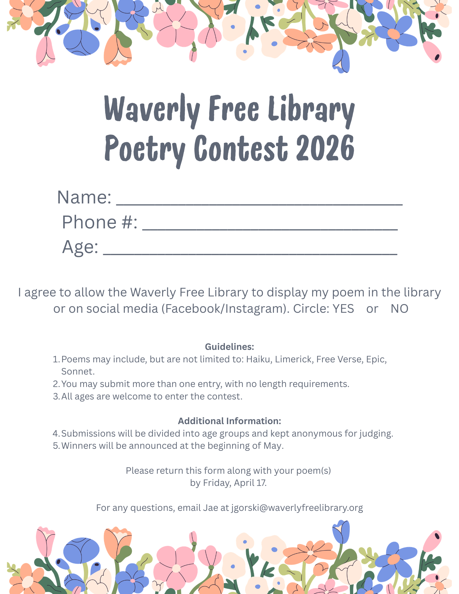 Spring Reading & Poetry Contest 2026 Download your Spring Reading Packet here, or stop into the library to pick up a packet! Waverly Free Library Poetry Contest 2026Download